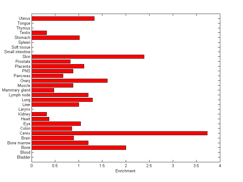 The expression level is normalized with tissue-library size. Each value for a gene in a tissue is a ratio of observed ESTs to the expected one in this tissue. The expected number of ESTs is the product of total ESTs of the gene and the fraction of total ESTs in the tissue among all ESTs in 30 tissues.