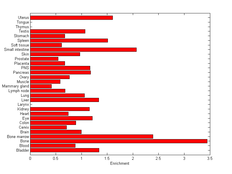 The expression level is normalized with tissue-library size. Each value for a gene in a tissue is a ratio of observed ESTs to the expected one in this tissue. The expected number of ESTs is the product of total ESTs of the gene and the fraction of total ESTs in the tissue among all ESTs in 30 tissues.