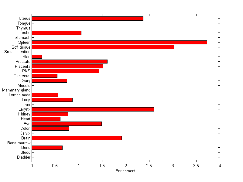The expression level is normalized with tissue-library size. Each value for a gene in a tissue is a ratio of observed ESTs to the expected one in this tissue. The expected number of ESTs is the product of total ESTs of the gene and the fraction of total ESTs in the tissue among all ESTs in 30 tissues.