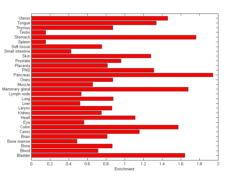 The expression level is normalized with tissue-library size. Each value for a gene in a tissue is a ratio of observed ESTs to the expected one in this tissue. The expected number of ESTs is the product of total ESTs of the gene and the fraction of total ESTs in the tissue among all ESTs in 30 tissues.