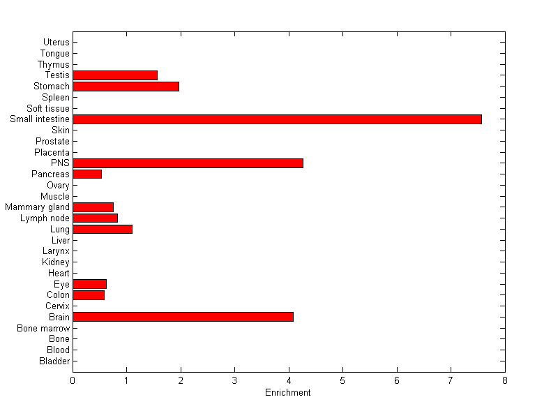 The expression level is normalized with tissue-library size. Each value for a gene in a tissue is a ratio of observed ESTs to the expected one in this tissue. The expected number of ESTs is the product of total ESTs of the gene and the fraction of total ESTs in the tissue among all ESTs in 30 tissues.