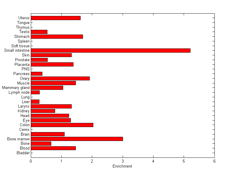 The expression level is normalized with tissue-library size. Each value for a gene in a tissue is a ratio of observed ESTs to the expected one in this tissue. The expected number of ESTs is the product of total ESTs of the gene and the fraction of total ESTs in the tissue among all ESTs in 30 tissues.