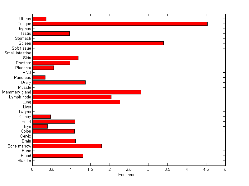 The expression level is normalized with tissue-library size. Each value for a gene in a tissue is a ratio of observed ESTs to the expected one in this tissue. The expected number of ESTs is the product of total ESTs of the gene and the fraction of total ESTs in the tissue among all ESTs in 30 tissues.