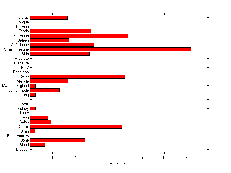 The expression level is normalized with tissue-library size. Each value for a gene in a tissue is a ratio of observed ESTs to the expected one in this tissue. The expected number of ESTs is the product of total ESTs of the gene and the fraction of total ESTs in the tissue among all ESTs in 30 tissues.