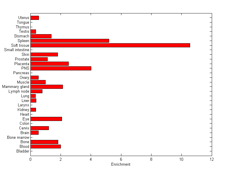 The expression level is normalized with tissue-library size. Each value for a gene in a tissue is a ratio of observed ESTs to the expected one in this tissue. The expected number of ESTs is the product of total ESTs of the gene and the fraction of total ESTs in the tissue among all ESTs in 30 tissues.