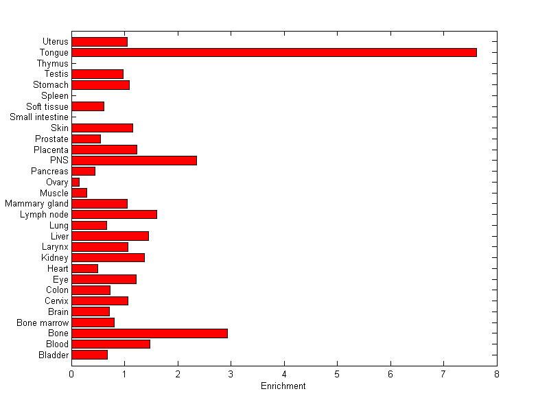 The expression level is normalized with tissue-library size. Each value for a gene in a tissue is a ratio of observed ESTs to the expected one in this tissue. The expected number of ESTs is the product of total ESTs of the gene and the fraction of total ESTs in the tissue among all ESTs in 30 tissues.