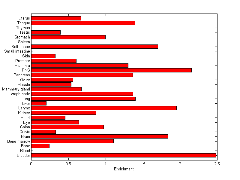 The expression level is normalized with tissue-library size. Each value for a gene in a tissue is a ratio of observed ESTs to the expected one in this tissue. The expected number of ESTs is the product of total ESTs of the gene and the fraction of total ESTs in the tissue among all ESTs in 30 tissues.
