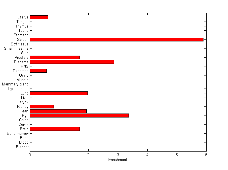 The expression level is normalized with tissue-library size. Each value for a gene in a tissue is a ratio of observed ESTs to the expected one in this tissue. The expected number of ESTs is the product of total ESTs of the gene and the fraction of total ESTs in the tissue among all ESTs in 30 tissues.
