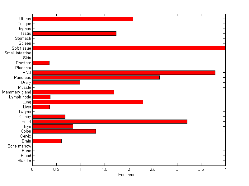 The expression level is normalized with tissue-library size. Each value for a gene in a tissue is a ratio of observed ESTs to the expected one in this tissue. The expected number of ESTs is the product of total ESTs of the gene and the fraction of total ESTs in the tissue among all ESTs in 30 tissues.