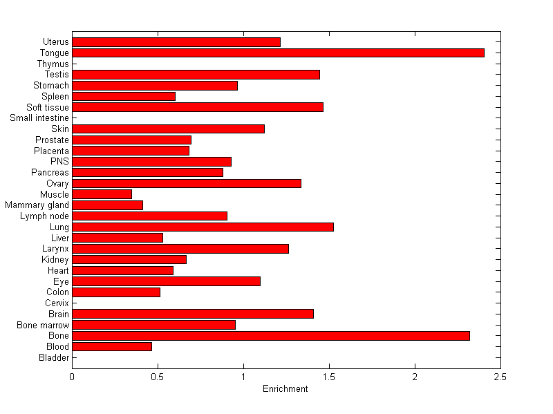 The expression level is normalized with tissue-library size. Each value for a gene in a tissue is a ratio of observed ESTs to the expected one in this tissue. The expected number of ESTs is the product of total ESTs of the gene and the fraction of total ESTs in the tissue among all ESTs in 30 tissues.