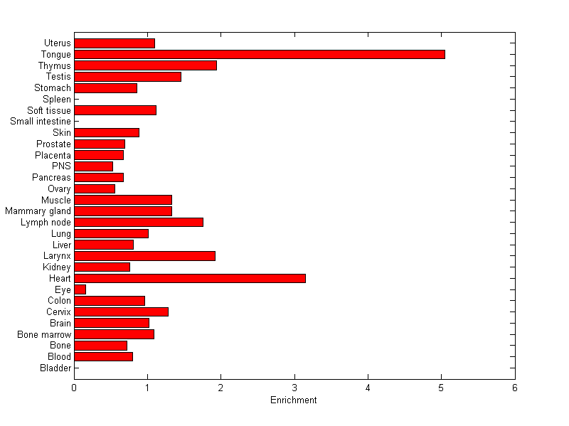 The expression level is normalized with tissue-library size. Each value for a gene in a tissue is a ratio of observed ESTs to the expected one in this tissue. The expected number of ESTs is the product of total ESTs of the gene and the fraction of total ESTs in the tissue among all ESTs in 30 tissues.