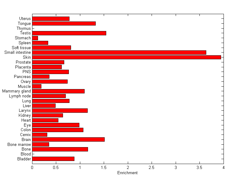 The expression level is normalized with tissue-library size. Each value for a gene in a tissue is a ratio of observed ESTs to the expected one in this tissue. The expected number of ESTs is the product of total ESTs of the gene and the fraction of total ESTs in the tissue among all ESTs in 30 tissues.