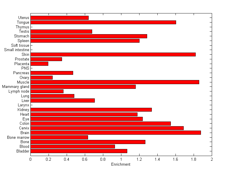 The expression level is normalized with tissue-library size. Each value for a gene in a tissue is a ratio of observed ESTs to the expected one in this tissue. The expected number of ESTs is the product of total ESTs of the gene and the fraction of total ESTs in the tissue among all ESTs in 30 tissues.