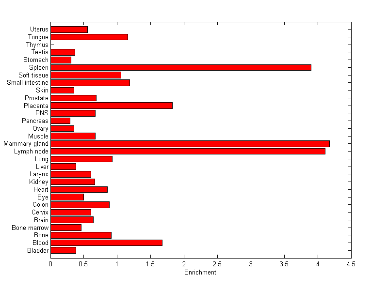 The expression level is normalized with tissue-library size. Each value for a gene in a tissue is a ratio of observed ESTs to the expected one in this tissue. The expected number of ESTs is the product of total ESTs of the gene and the fraction of total ESTs in the tissue among all ESTs in 30 tissues.