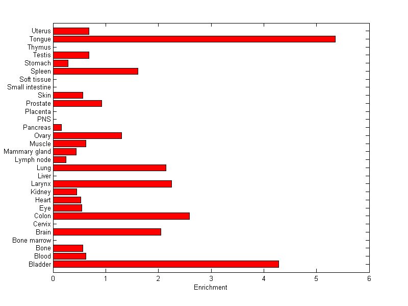 The expression level is normalized with tissue-library size. Each value for a gene in a tissue is a ratio of observed ESTs to the expected one in this tissue. The expected number of ESTs is the product of total ESTs of the gene and the fraction of total ESTs in the tissue among all ESTs in 30 tissues.
