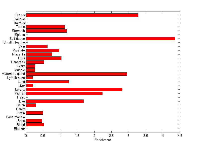 The expression level is normalized with tissue-library size. Each value for a gene in a tissue is a ratio of observed ESTs to the expected one in this tissue. The expected number of ESTs is the product of total ESTs of the gene and the fraction of total ESTs in the tissue among all ESTs in 30 tissues.