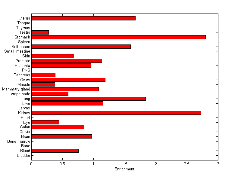 The expression level is normalized with tissue-library size. Each value for a gene in a tissue is a ratio of observed ESTs to the expected one in this tissue. The expected number of ESTs is the product of total ESTs of the gene and the fraction of total ESTs in the tissue among all ESTs in 30 tissues.