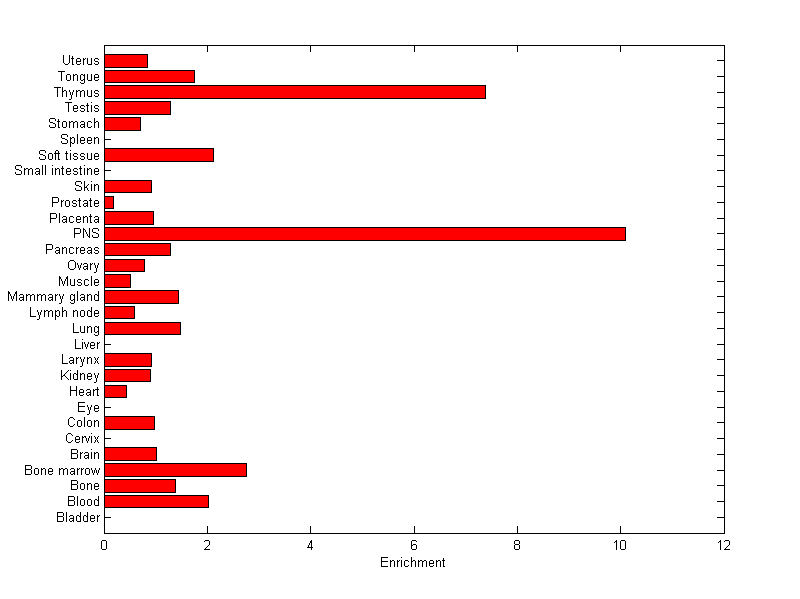 The expression level is normalized with tissue-library size. Each value for a gene in a tissue is a ratio of observed ESTs to the expected one in this tissue. The expected number of ESTs is the product of total ESTs of the gene and the fraction of total ESTs in the tissue among all ESTs in 30 tissues.