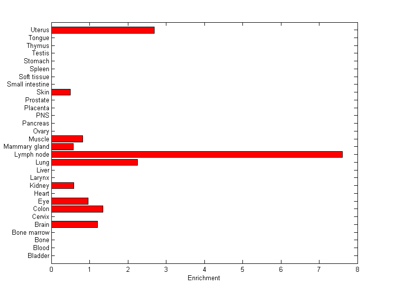 The expression level is normalized with tissue-library size. Each value for a gene in a tissue is a ratio of observed ESTs to the expected one in this tissue. The expected number of ESTs is the product of total ESTs of the gene and the fraction of total ESTs in the tissue among all ESTs in 30 tissues.