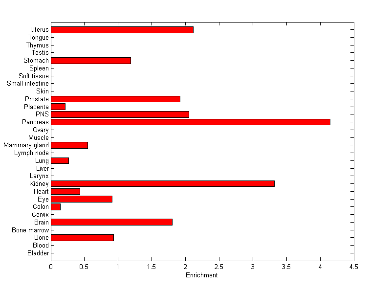 The expression level is normalized with tissue-library size. Each value for a gene in a tissue is a ratio of observed ESTs to the expected one in this tissue. The expected number of ESTs is the product of total ESTs of the gene and the fraction of total ESTs in the tissue among all ESTs in 30 tissues.