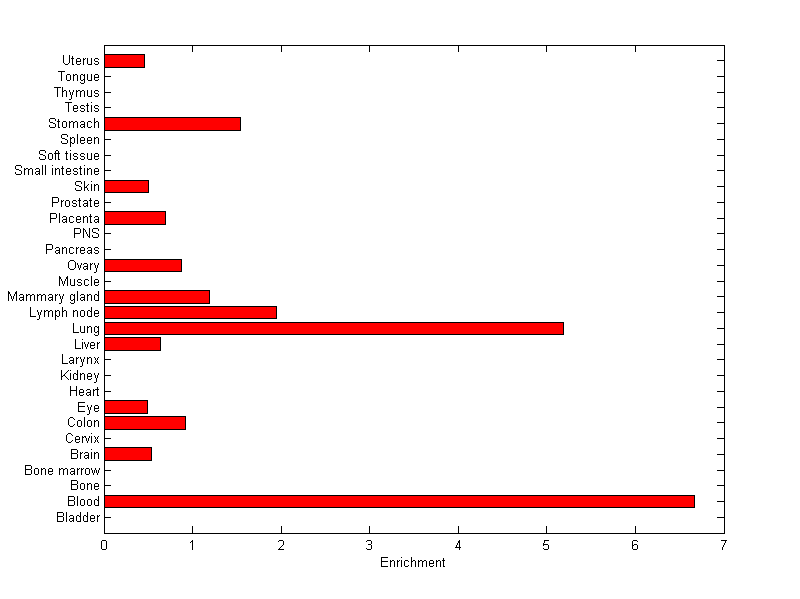 The expression level is normalized with tissue-library size. Each value for a gene in a tissue is a ratio of observed ESTs to the expected one in this tissue. The expected number of ESTs is the product of total ESTs of the gene and the fraction of total ESTs in the tissue among all ESTs in 30 tissues.