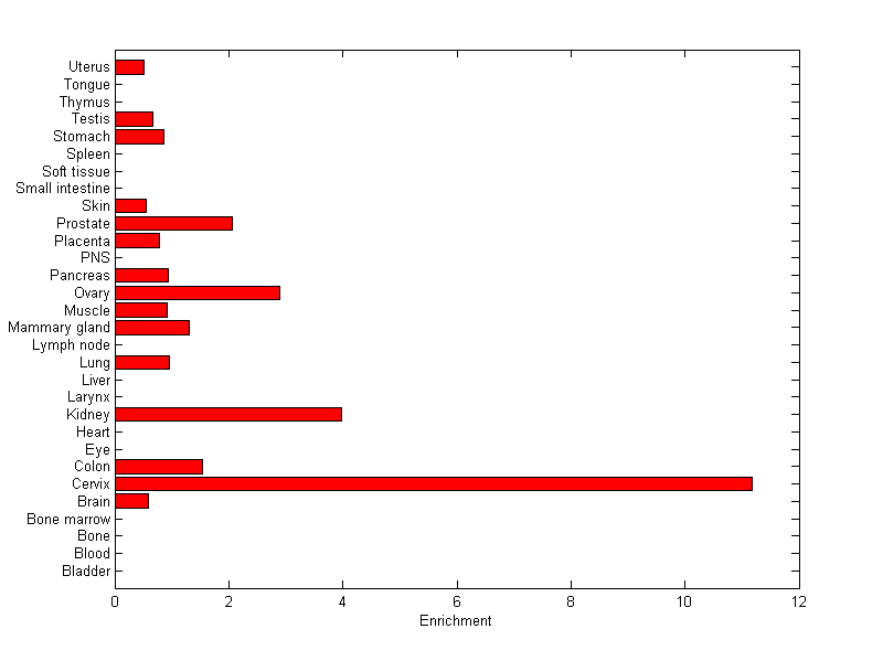 The expression level is normalized with tissue-library size. Each value for a gene in a tissue is a ratio of observed ESTs to the expected one in this tissue. The expected number of ESTs is the product of total ESTs of the gene and the fraction of total ESTs in the tissue among all ESTs in 30 tissues.