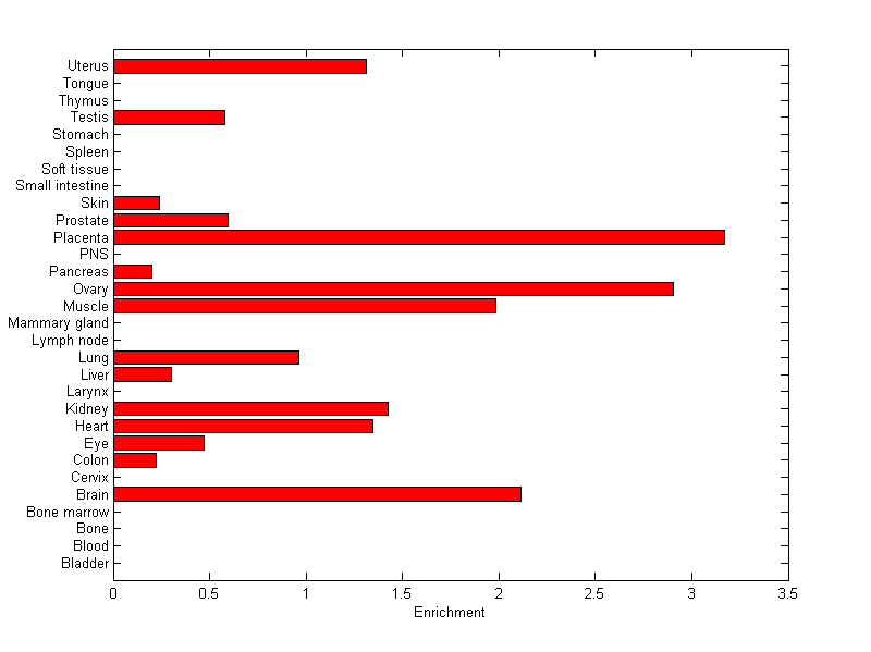 The expression level is normalized with tissue-library size. Each value for a gene in a tissue is a ratio of observed ESTs to the expected one in this tissue. The expected number of ESTs is the product of total ESTs of the gene and the fraction of total ESTs in the tissue among all ESTs in 30 tissues.