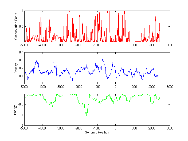 About the profiles: The conservation profile (red curve) is about conservation scores of the promoter sequences. Conservation was determined from an eight-way alignment of human, chimpanzee, dog, mouse, rat, chicken, zebrafish and fugu sequences. The conservation was quantified by a conservation score between 0 and 1, with 1 as highest conservation. The conservation score was obtained from UCSC genome databases. The density profile (blue curve) is about density of all TF binding sites. The energy profile (green curve) is about energy for module detection based on TF interaction. The positions with energy less than -1 indicate the existence of CRMs. Download: Conservation profileDensity profile Energy profile CRM summary |
