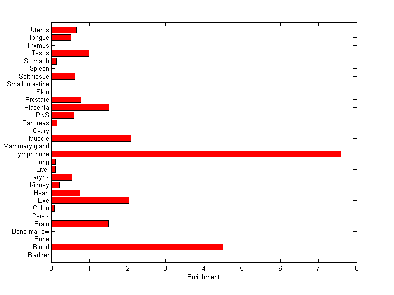 About the profile: The expression level is normalized with tissue-library size. Each value for a gene in a tissue is a ratio of observed ESTs to the expected one in this tissue. The expected number of ESTs is the product of total ESTs of the gene and the fraction of total ESTs in the tissue among all ESTs in 30 tissues. Summary: This gene is preferentially expressed in [lymph_node] Download: |