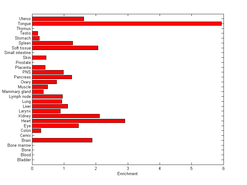The expression level is normalized with tissue-library size. Each value for a gene in a tissue is a ratio of observed ESTs to the expected one in this tissue. The expected number of ESTs is the product of total ESTs of the gene and the fraction of total ESTs in the tissue among all ESTs in 30 tissues.