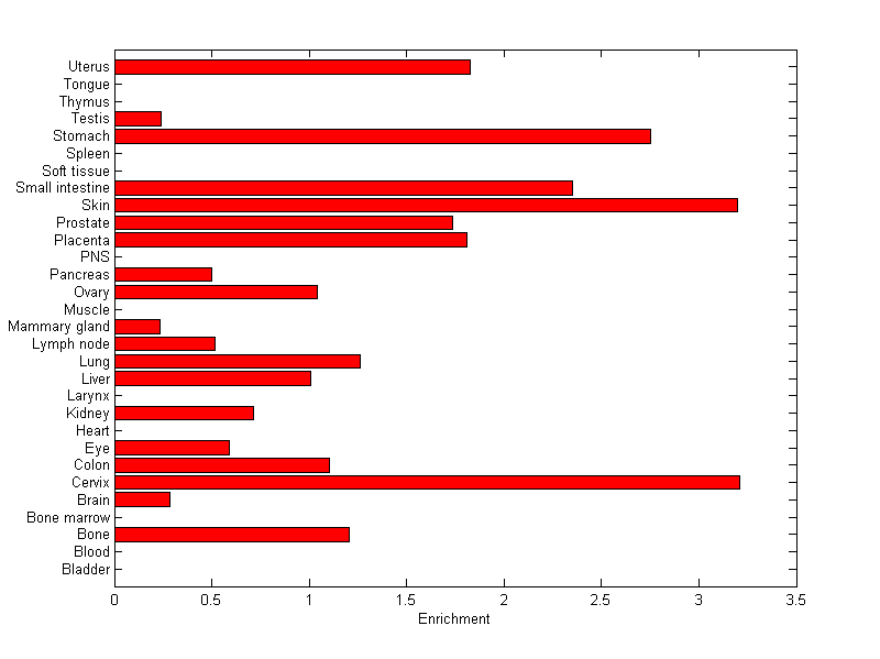 The expression level is normalized with tissue-library size. Each value for a gene in a tissue is a ratio of observed ESTs to the expected one in this tissue. The expected number of ESTs is the product of total ESTs of the gene and the fraction of total ESTs in the tissue among all ESTs in 30 tissues.
