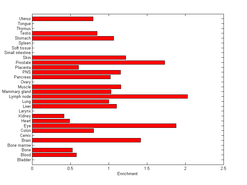 The expression level is normalized with tissue-library size. Each value for a gene in a tissue is a ratio of observed ESTs to the expected one in this tissue. The expected number of ESTs is the product of total ESTs of the gene and the fraction of total ESTs in the tissue among all ESTs in 30 tissues.