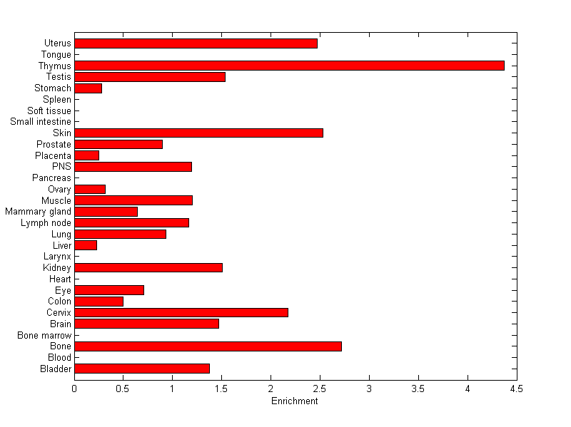 The expression level is normalized with tissue-library size. Each value for a gene in a tissue is a ratio of observed ESTs to the expected one in this tissue. The expected number of ESTs is the product of total ESTs of the gene and the fraction of total ESTs in the tissue among all ESTs in 30 tissues.