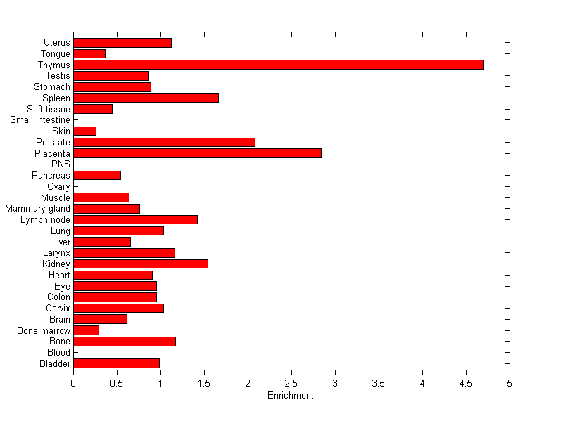 The expression level is normalized with tissue-library size. Each value for a gene in a tissue is a ratio of observed ESTs to the expected one in this tissue. The expected number of ESTs is the product of total ESTs of the gene and the fraction of total ESTs in the tissue among all ESTs in 30 tissues.