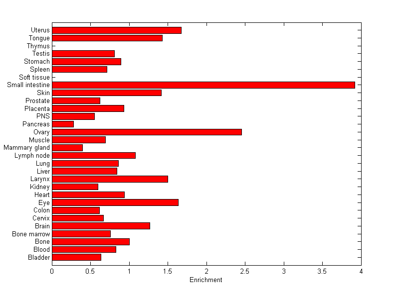 The expression level is normalized with tissue-library size. Each value for a gene in a tissue is a ratio of observed ESTs to the expected one in this tissue. The expected number of ESTs is the product of total ESTs of the gene and the fraction of total ESTs in the tissue among all ESTs in 30 tissues.