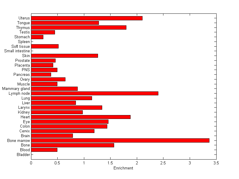The expression level is normalized with tissue-library size. Each value for a gene in a tissue is a ratio of observed ESTs to the expected one in this tissue. The expected number of ESTs is the product of total ESTs of the gene and the fraction of total ESTs in the tissue among all ESTs in 30 tissues.