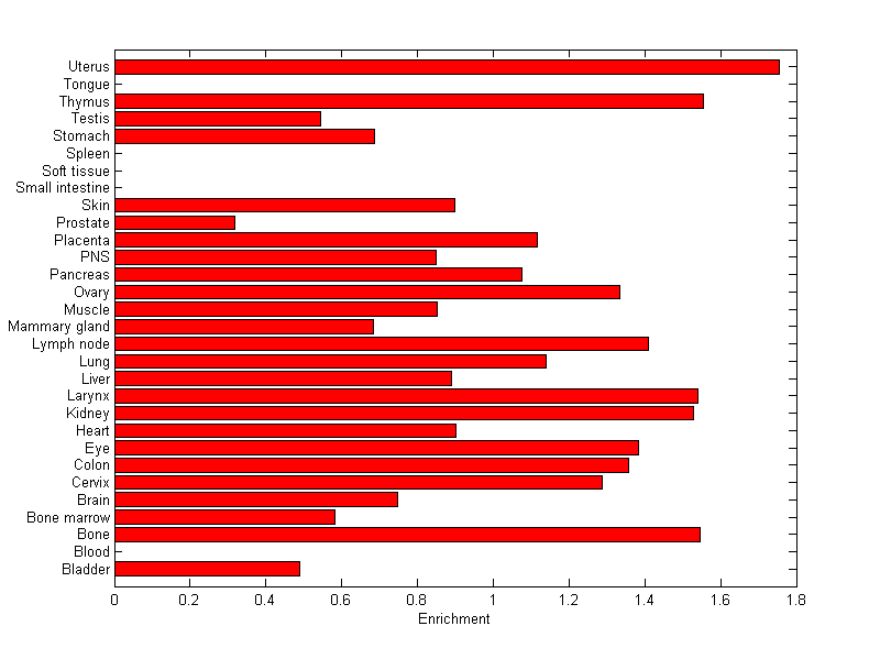 The expression level is normalized with tissue-library size. Each value for a gene in a tissue is a ratio of observed ESTs to the expected one in this tissue. The expected number of ESTs is the product of total ESTs of the gene and the fraction of total ESTs in the tissue among all ESTs in 30 tissues.