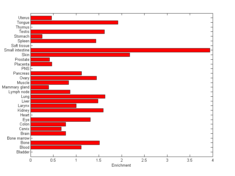 The expression level is normalized with tissue-library size. Each value for a gene in a tissue is a ratio of observed ESTs to the expected one in this tissue. The expected number of ESTs is the product of total ESTs of the gene and the fraction of total ESTs in the tissue among all ESTs in 30 tissues.