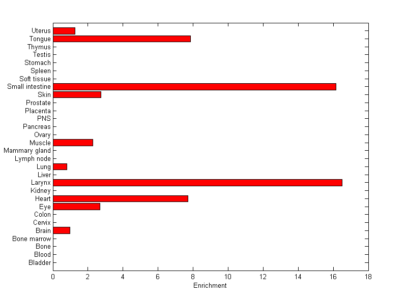 The expression level is normalized with tissue-library size. Each value for a gene in a tissue is a ratio of observed ESTs to the expected one in this tissue. The expected number of ESTs is the product of total ESTs of the gene and the fraction of total ESTs in the tissue among all ESTs in 30 tissues.