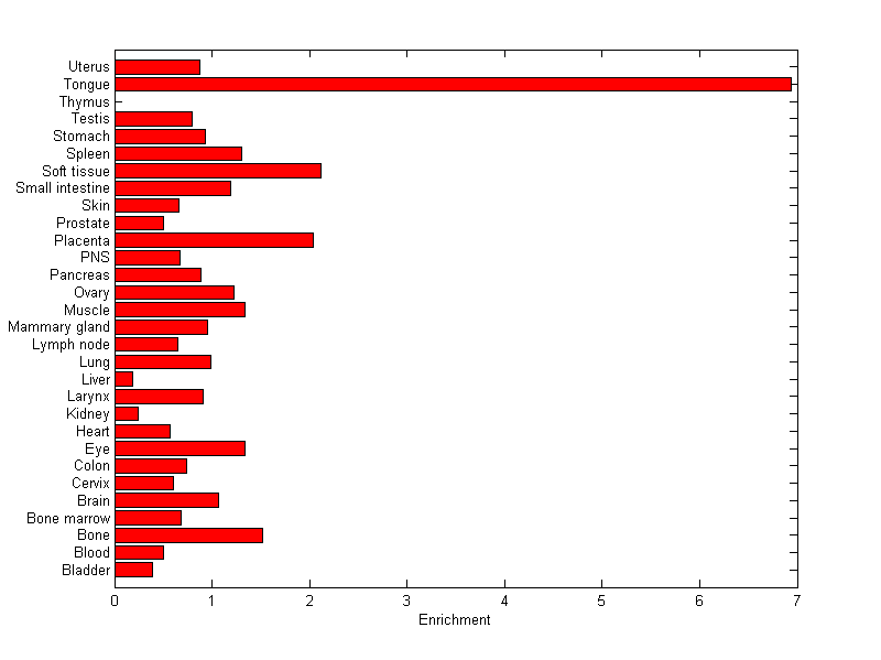 The expression level is normalized with tissue-library size. Each value for a gene in a tissue is a ratio of observed ESTs to the expected one in this tissue. The expected number of ESTs is the product of total ESTs of the gene and the fraction of total ESTs in the tissue among all ESTs in 30 tissues.