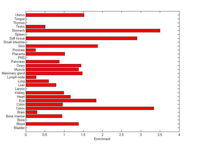 The expression level is normalized with tissue-library size. Each value for a gene in a tissue is a ratio of observed ESTs to the expected one in this tissue. The expected number of ESTs is the product of total ESTs of the gene and the fraction of total ESTs in the tissue among all ESTs in 30 tissues.