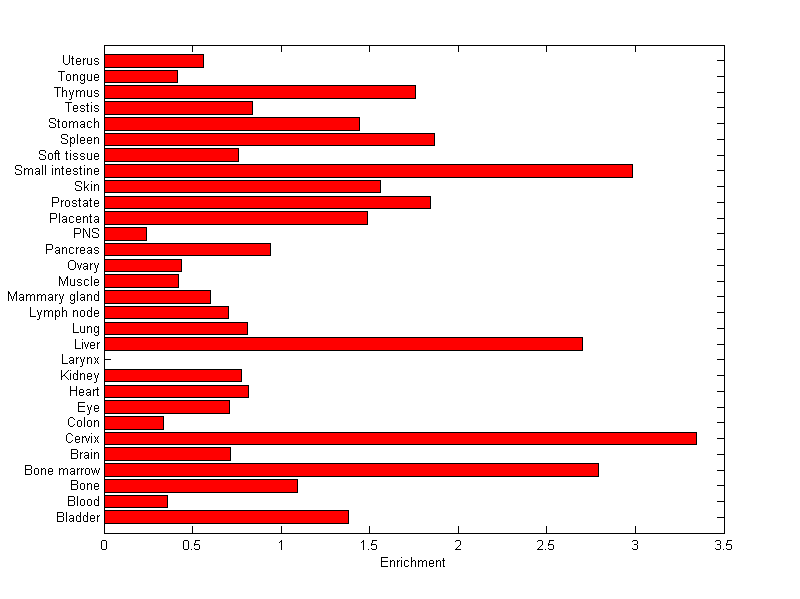 The expression level is normalized with tissue-library size. Each value for a gene in a tissue is a ratio of observed ESTs to the expected one in this tissue. The expected number of ESTs is the product of total ESTs of the gene and the fraction of total ESTs in the tissue among all ESTs in 30 tissues.