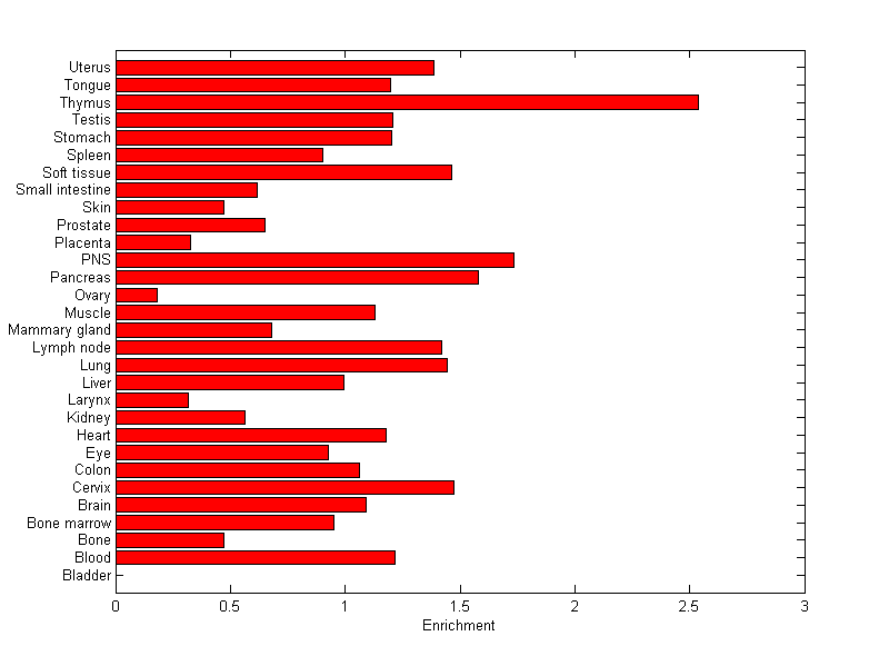 The expression level is normalized with tissue-library size. Each value for a gene in a tissue is a ratio of observed ESTs to the expected one in this tissue. The expected number of ESTs is the product of total ESTs of the gene and the fraction of total ESTs in the tissue among all ESTs in 30 tissues.