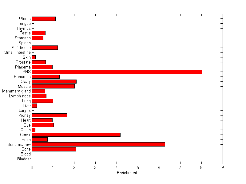 About the profile: The expression level is normalized with tissue-library size. Each value for a gene in a tissue is a ratio of observed ESTs to the expected one in this tissue. The expected number of ESTs is the product of total ESTs of the gene and the fraction of total ESTs in the tissue among all ESTs in 30 tissues. Summary: This gene is preferentially expressed in [bone_marrow, peripheral_nervous_system] Download: |