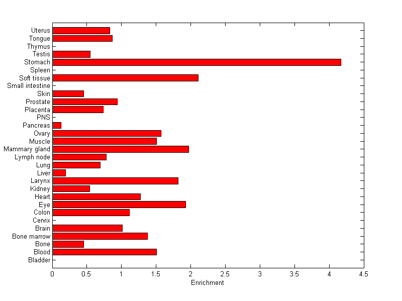 The expression level is normalized with tissue-library size. Each value for a gene in a tissue is a ratio of observed ESTs to the expected one in this tissue. The expected number of ESTs is the product of total ESTs of the gene and the fraction of total ESTs in the tissue among all ESTs in 30 tissues.