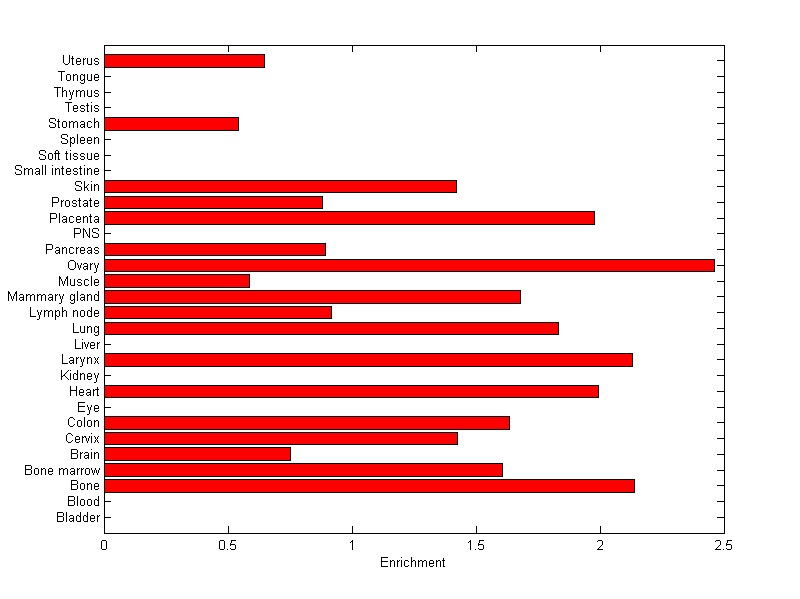 The expression level is normalized with tissue-library size. Each value for a gene in a tissue is a ratio of observed ESTs to the expected one in this tissue. The expected number of ESTs is the product of total ESTs of the gene and the fraction of total ESTs in the tissue among all ESTs in 30 tissues.