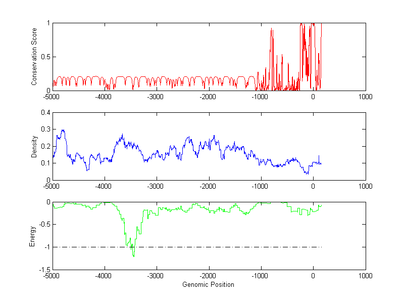 About the profiles: The conservation profile (red curve) is about conservation scores of the promoter sequences. Conservation was determined from an eight-way alignment of human, chimpanzee, dog, mouse, rat, chicken, zebrafish and fugu sequences. The conservation was quantified by a conservation score between 0 and 1, with 1 as highest conservation. The conservation score was obtained from UCSC genome databases. The density profile (blue curve) is about density of all TF binding sites. The energy profile (green curve) is about energy for module detection based on TF interaction. The positions with energy less than -1 indicate the existence of CRMs. Download: Conservation profileDensity profile Energy profile CRM summary |
