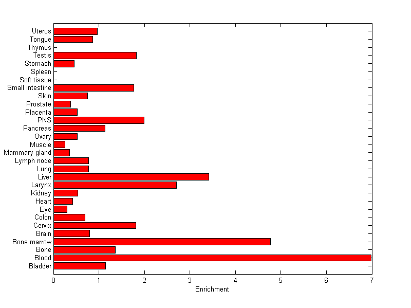 About the profile: The expression level is normalized with tissue-library size. Each value for a gene in a tissue is a ratio of observed ESTs to the expected one in this tissue. The expected number of ESTs is the product of total ESTs of the gene and the fraction of total ESTs in the tissue among all ESTs in 30 tissues. Summary: This gene is preferentially expressed in [blood] Download: |