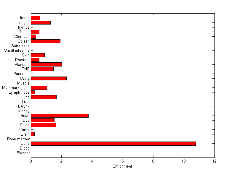 About the profile: The expression level is normalized with tissue-library size. Each value for a gene in a tissue is a ratio of observed ESTs to the expected one in this tissue. The expected number of ESTs is the product of total ESTs of the gene and the fraction of total ESTs in the tissue among all ESTs in 30 tissues. Summary: This gene is preferentially expressed in [bone] Download: |