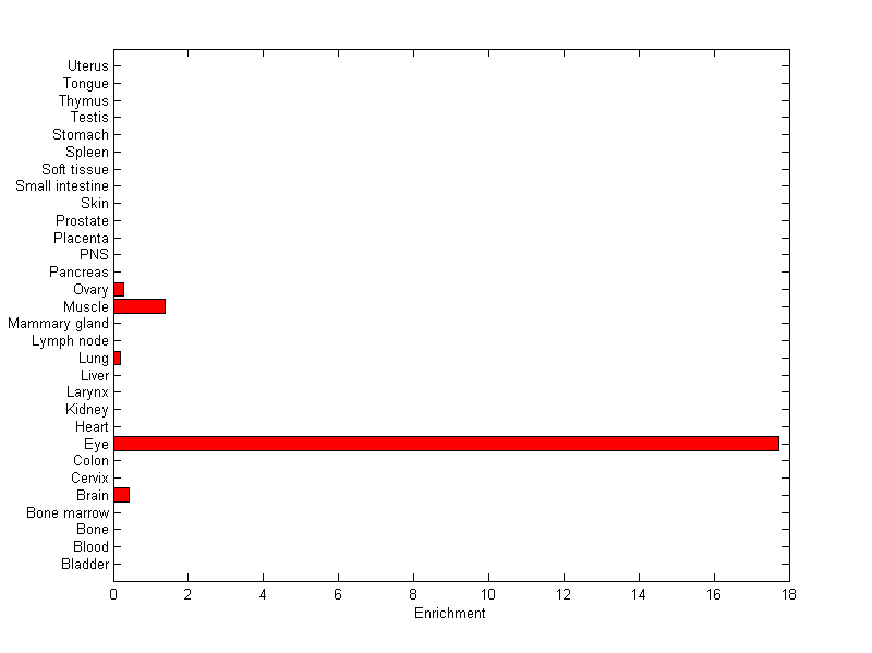 The expression level is normalized with tissue-library size. Each value for a gene in a tissue is a ratio of observed ESTs to the expected one in this tissue. The expected number of ESTs is the product of total ESTs of the gene and the fraction of total ESTs in the tissue among all ESTs in 30 tissues.